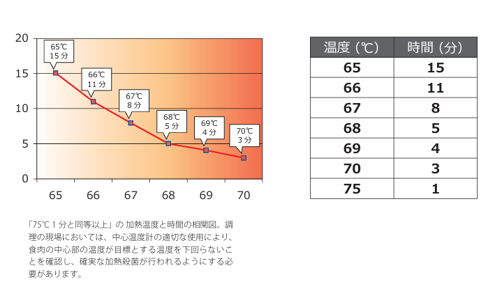 野生鳥獣肉の衛生管理に関する指針(ガイドライン)では肉の「中心部の温度が75℃で1分間以上又はこれと同等以上の効力を有する方法により、十分加熱して喫食すること」と定められています。この「同等以上の効力を有する方法」に該当する加熱温度と加熱時間は、下のグラフで表されている通りです。