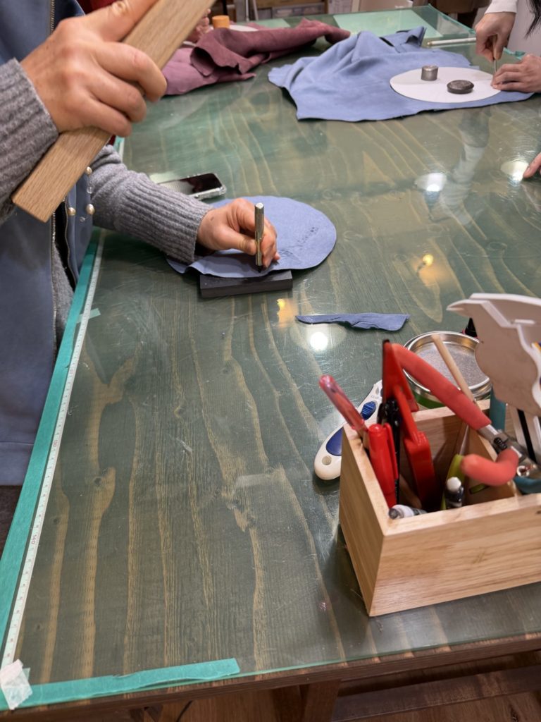 ポンチという道具でトントン穴をあけます!きんちゃくはけっこう穴がありますが、こちらもスポッと穴が開くのが楽しくて、作業がどんどん進みます。
