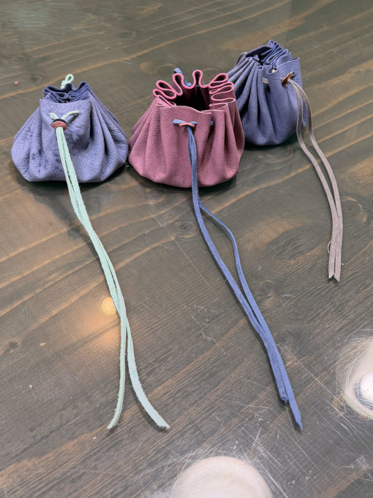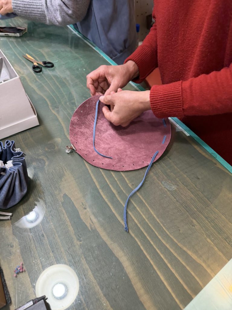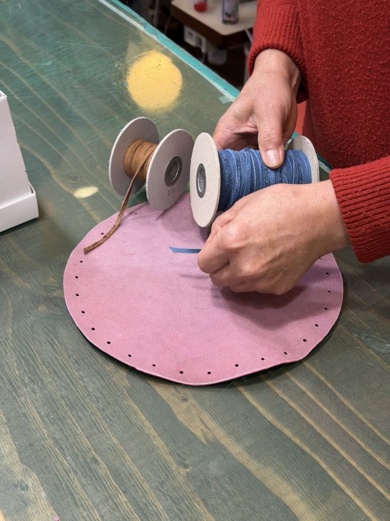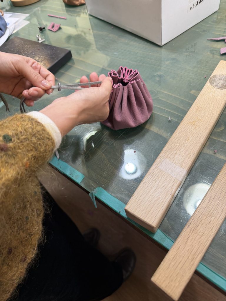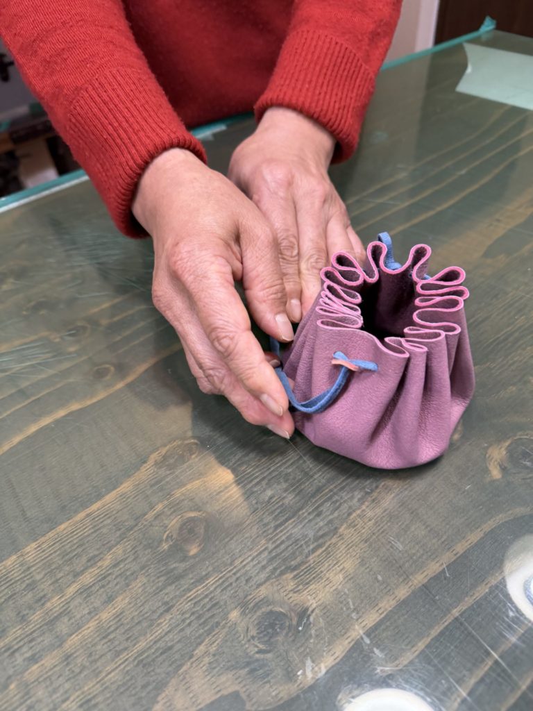 丸く切った革にひもを通し、キュッと絞ると立体的なきんちゃく袋に!留め具パーツも鹿革で作ったものを取付けます。