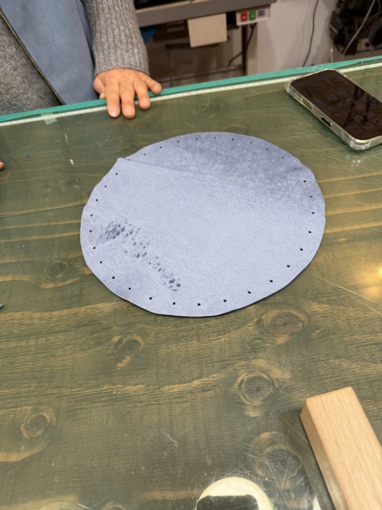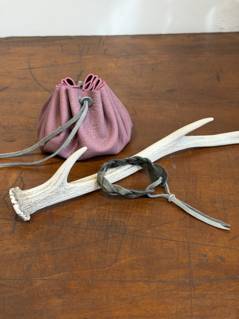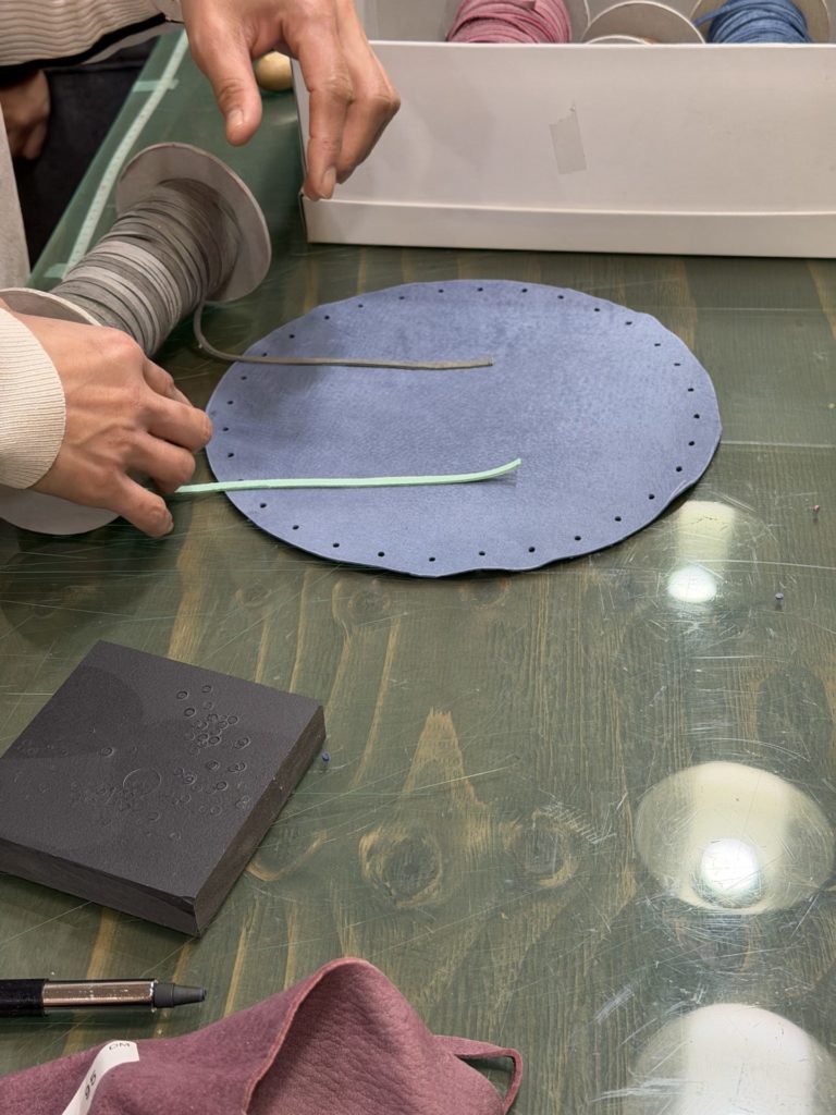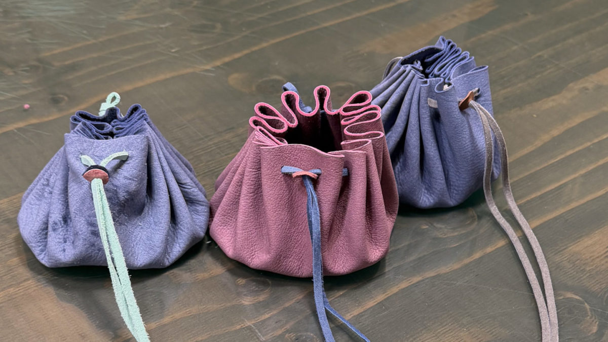 丸く切った革にひもを通し、キュッと絞ると立体的なきんちゃく袋に!留め具パーツも鹿革で作ったものを取付けます。