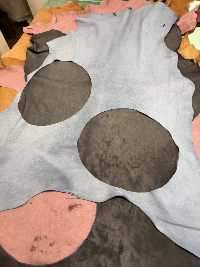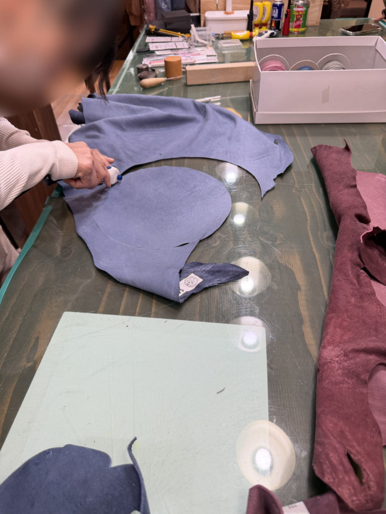 革を選んだら、型紙を使って印をつけます。こちらは大きな鹿革からの切り出しになります!布のように扱うことができる、柔らかい鹿革ならではの制作技法です。