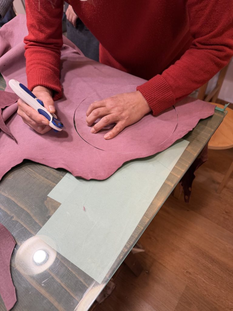 裁断にはロータリーカッターを使います。もっちりした鹿革にはサクッと刃が入って、少ない力で簡単に切ることができます。